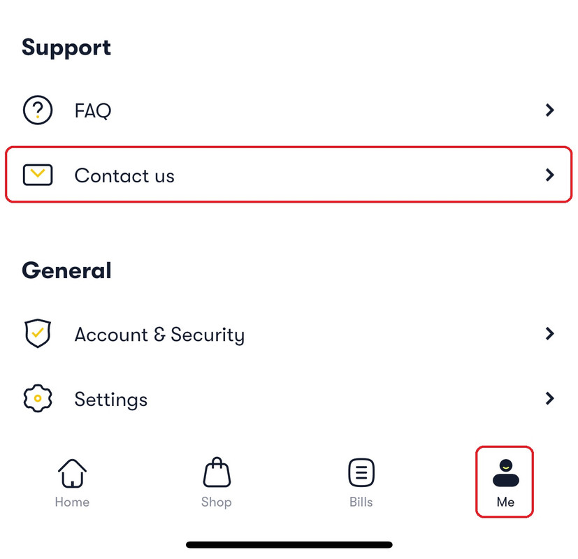 4. After submitting your application, Click "ME", then scroll to and select "CONTACT US"