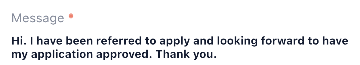 10. Write this message: Hi. I have been referred to apply and looking forward to have my application approved. Thank you.